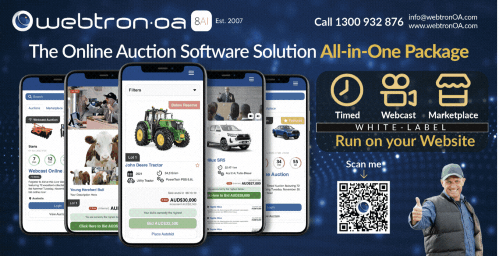 Since 2007, Webtron has empowered auctioneers with powerful online auction tools designed to drive bidder engagement and maximise clearing sale results. Our feature-rich platform allows you to run fully branded, self-managed online auctions directly from your own website—delivering greater reach, stronger control, and a more professional buyer experience.